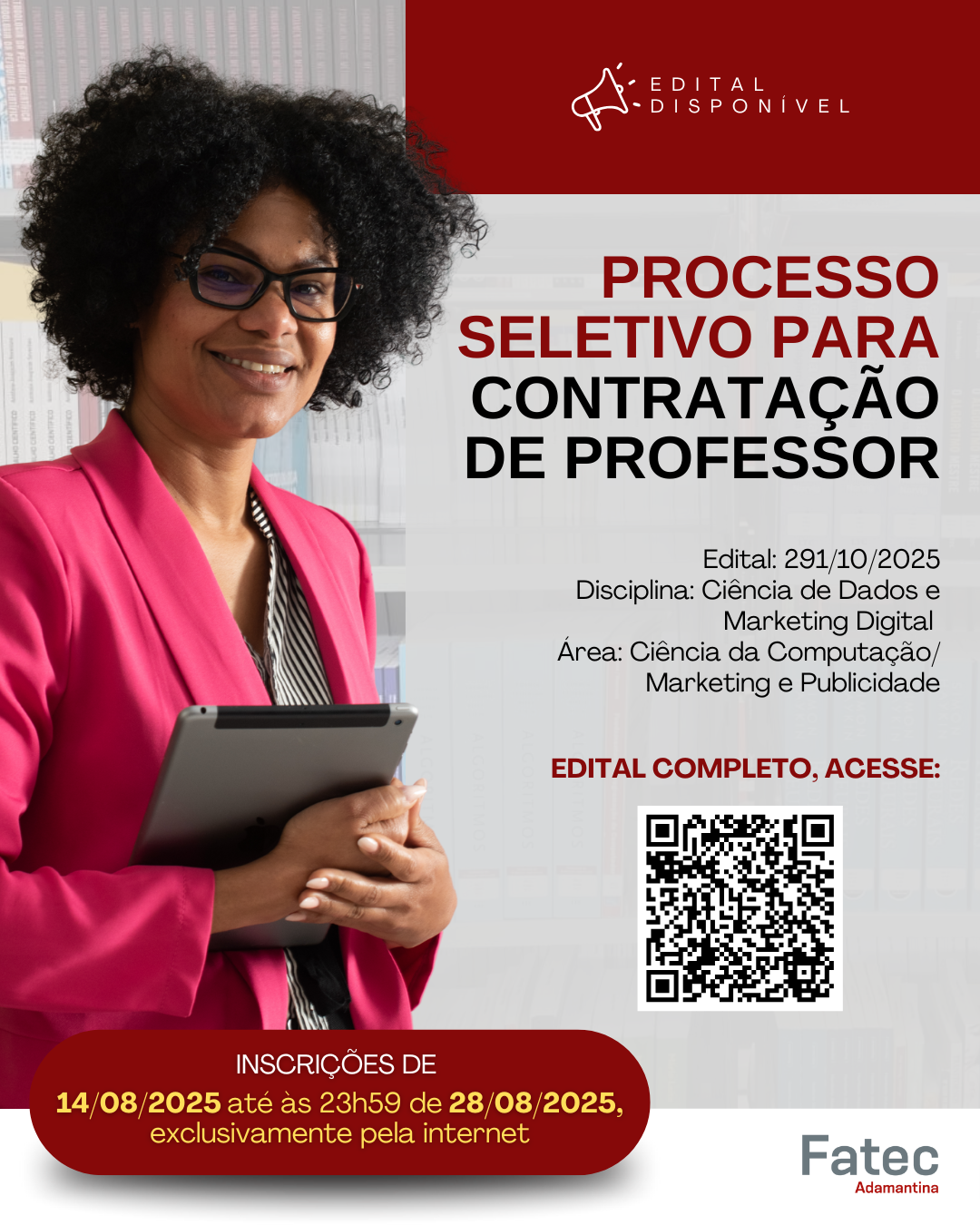 De acordo com o Edital 291/10/2025, o professor da disciplina de Ciência de Dados e Marketing Digital deve ser profissional com experiência nas áreas de Ciência da Computação ou Marketing e Publicidade e atender aos requisitos da função e titulação informados no Anexo II do edital. As inscrições neste PSS seguem até as 23h59 de 28 de agosto, exclusivamente pelo hotsite: https://urhsistemas.cps.sp.gov.br/dgsdad/selecaopublica/FATEC/PSS/Detalhes.aspx?oljioahohafnav87412=8009&miji431dqd.