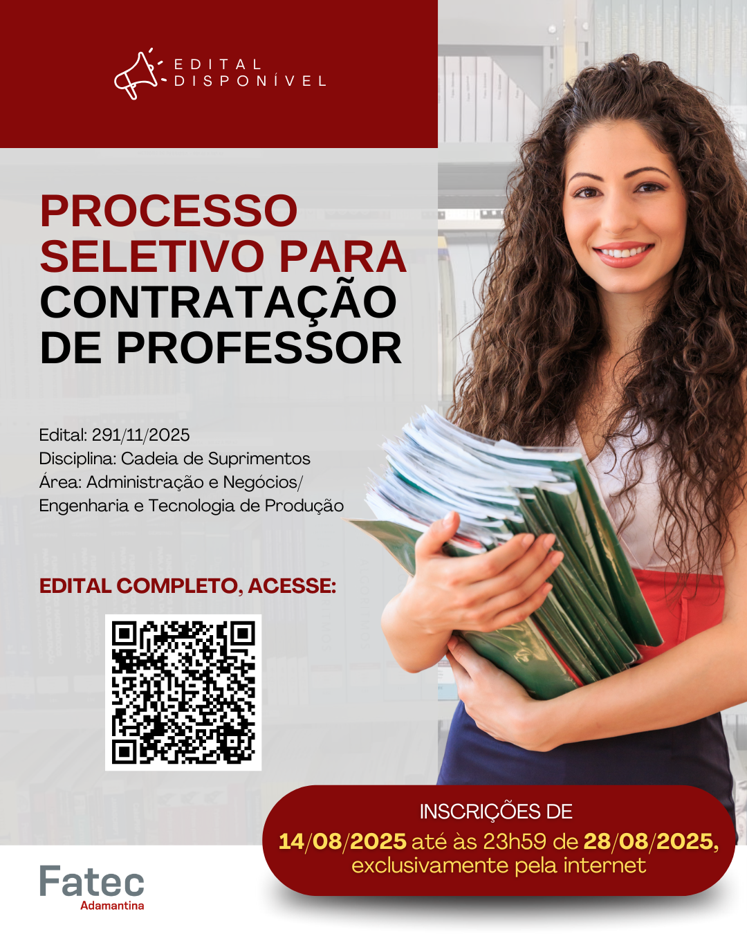 Já o Edital 291/11/2025, sobre a disciplina de Cadeia de Suprimentos, indica que o candidato à vaga precisa ter atuado nas áreas de Administração e Negócios ou Engenharia e Tecnologia de Produção e atender aos requisitos da função e titulação informados no Anexo II do edital. Para este PSS, as inscrições se estendem até as 23h59 do dia 28 de agosto pelo endereço: https://urhsistemas.cps.sp.gov.br/dgsdad/selecaopublica/FATEC/PSS/Detalhes.aspx?oljioahohafnav87412=8010&miji431dqd.