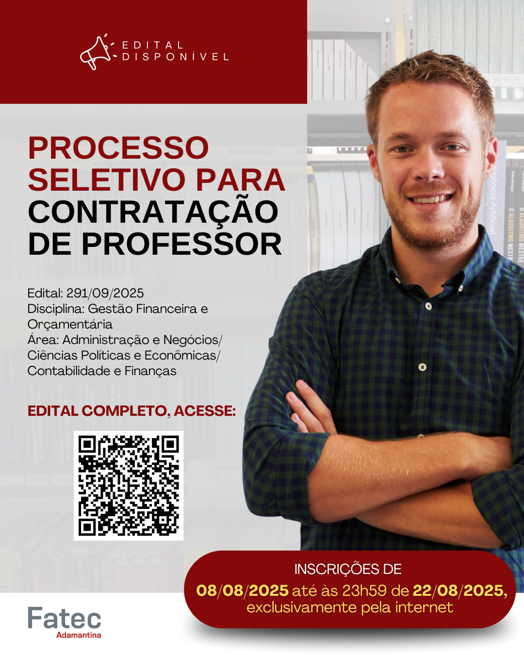 Segundo o Edital 291/09/2025, o docente interessado em lecionar na disciplina de Gestão Financeira e Orçamentária, deve ter experiência nas áreas de Administração e Negócios, Ciências Políticas e Econômicas ou Contabilidade e Finanças e atender aos requisitos da função e titulação informados no Anexo II do edital. As inscrições para esse PSS podem ser feitas até as 23h59 do dia 22 de agosto pelo link: https://urhsistemas.cps.sp.gov.br/dgsdad/selecaopublica/FATEC/PSS/Detalhes.aspx?oljioahohafnav87412=7794&miji431dqd.