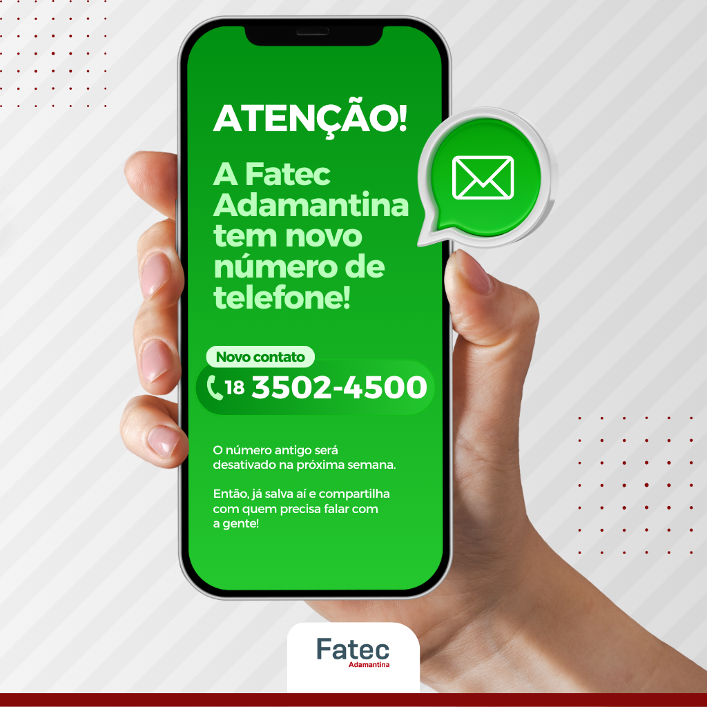 A Faculdade de Tecnologia (Fatec) de Adamantina está com um novo número de telefone para contato externo: (18) 3502-4500. O recado é importante — o número antigo será desativado em breve, então vale anotar o novo na agenda.