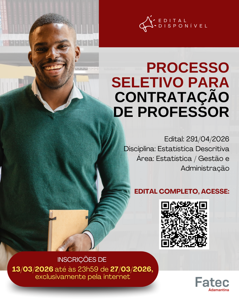 O Centro Paula Souza (CPS) abriu nesta sexta-feira, 13, o período de inscrições para o Processo Seletivo Simplificado (PSS) destinado à contratação de docente para o curso de Ciência de Dados da Faculdade de Tecnologia do Estado de São Paulo (Fatec) de Adamantina.
