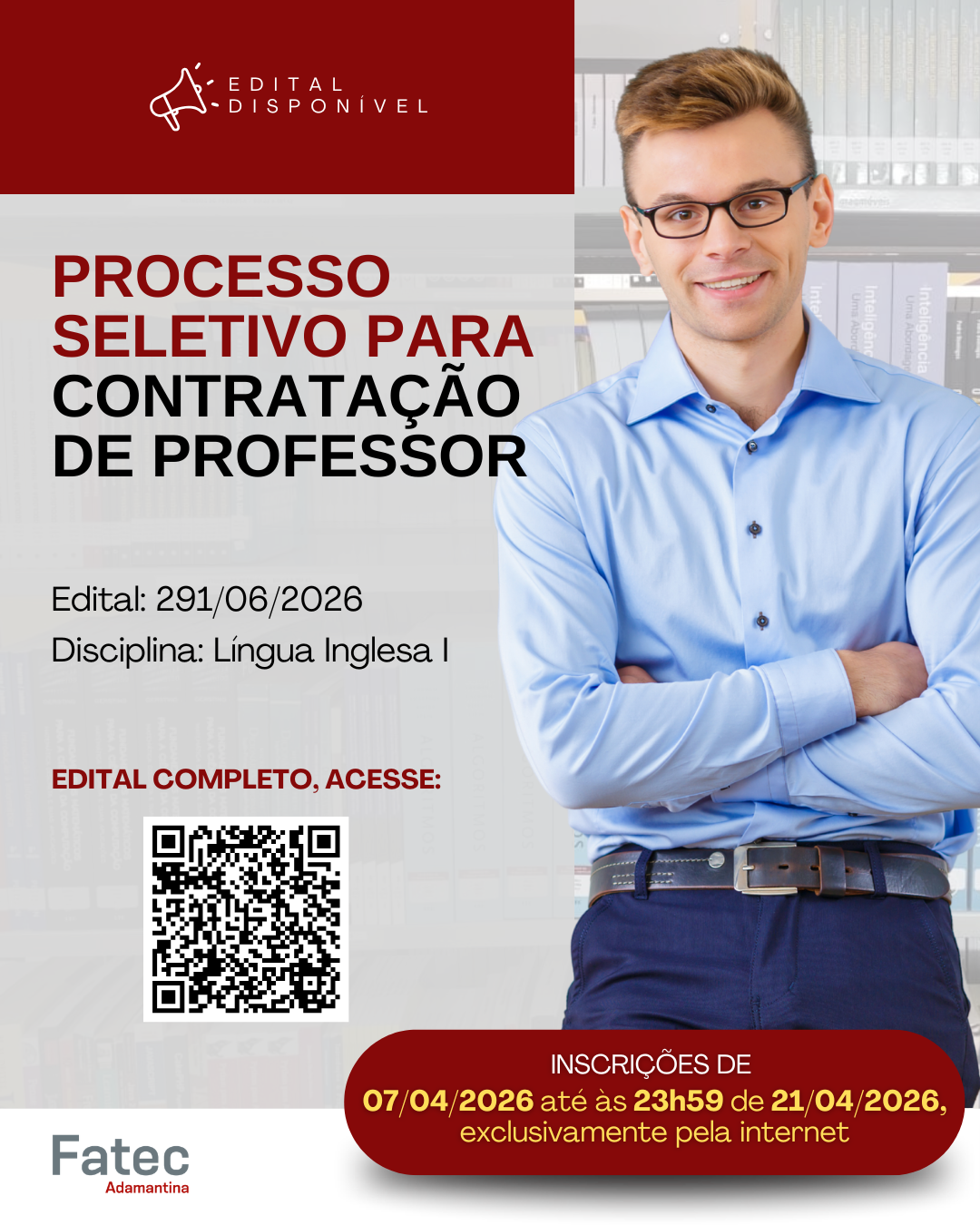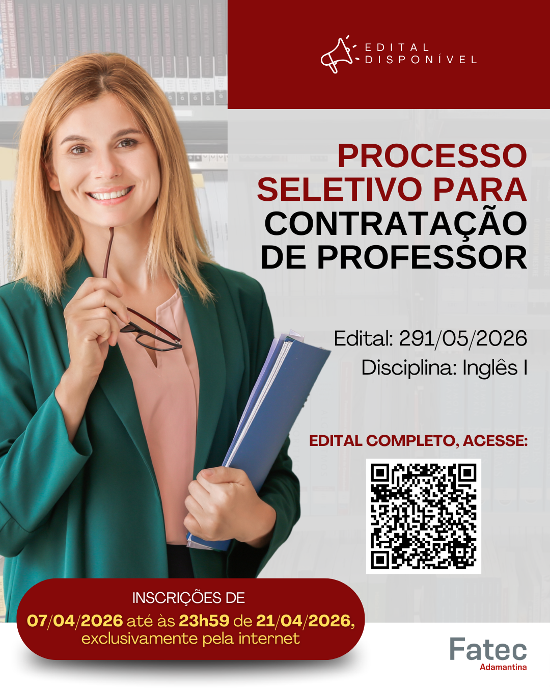 O Centro Paula Souza (CPS) abriu nesta terça-feira, 7, as inscrições para dois Processos Seletivos Simplificados (PSSs) destinados à contratação temporária de docentes para disciplinas de Inglês dos cursos tecnológicos de Ensino Superior da Faculdade de Tecnologia (Fatec) de Adamantina.